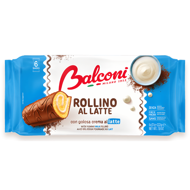 Balconi Rollino Al Latte pack 6 (222g) est une douceur italienne moelleuse et gourmande, composée de petits gâteaux roulés avec un délicieux fourrage au lait. Parfaits pour le petit-déjeuner, le goûter ou une pause sucrée rapide, ces rollinos offrent une texture légère et un goût doux qui plaît autant aux enfants qu’aux adultes.