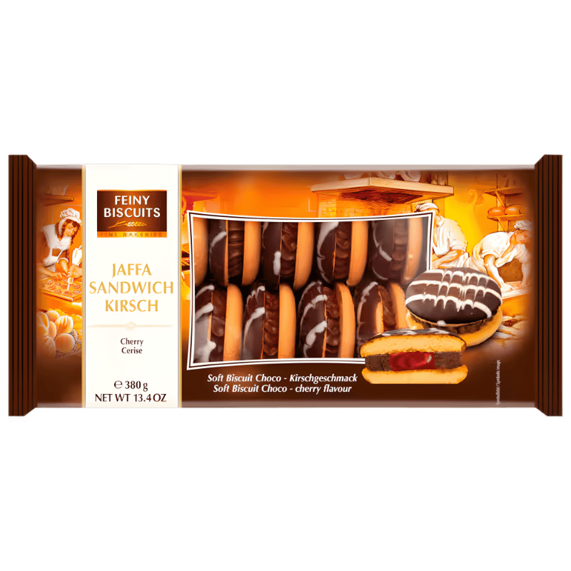 Feiny Biscuits Jaffa Sandwich Cerise 380g est un biscuit gourmand composé de deux couches moelleuses type génoise, garnies d’une gelée à la cerise et nappées d’un fin enrobage chocolaté. Ce classique revisité offre un équilibre parfait entre le goût fruité légèrement acidulé de la cerise et la douceur du chocolat.