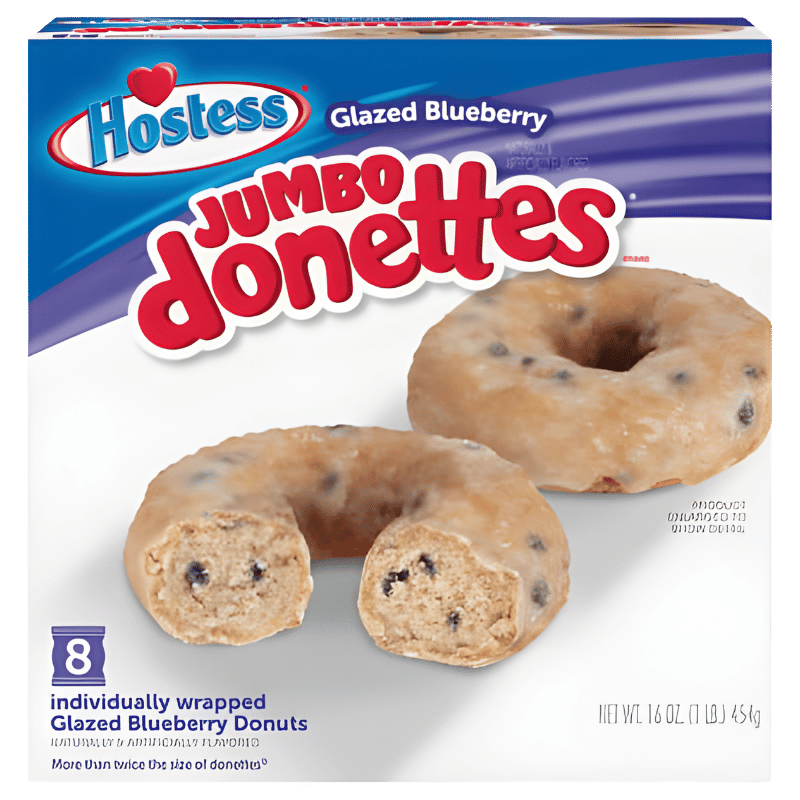 Hostess Jumbo Donettes Glazed Blueberry pack 8 (454g) est un grand classique des snacks américains : des mini donuts version jumbo, moelleux et gourmands, avec un glaçage sucré et une saveur myrtille (blueberry). Parfaits pour le petit-déjeuner, une pause café ou un goûter, ils offrent une texture douce et un goût fruité très agréable.