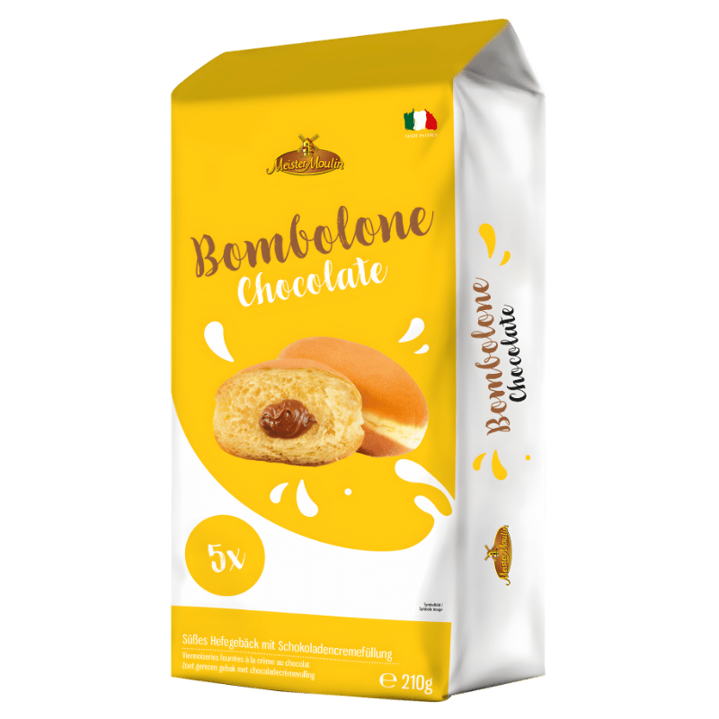 Meister Moulin Bombolone Chocolate 210g est une pâtisserie italienne moelleuse inspirée des bomboloni traditionnels, fourrée d’une crème chocolat fondante. Parfaite pour les amateurs de saveurs chocolatées, elle offre une texture légère à l’extérieur et un cœur riche et gourmand à l’intérieur.