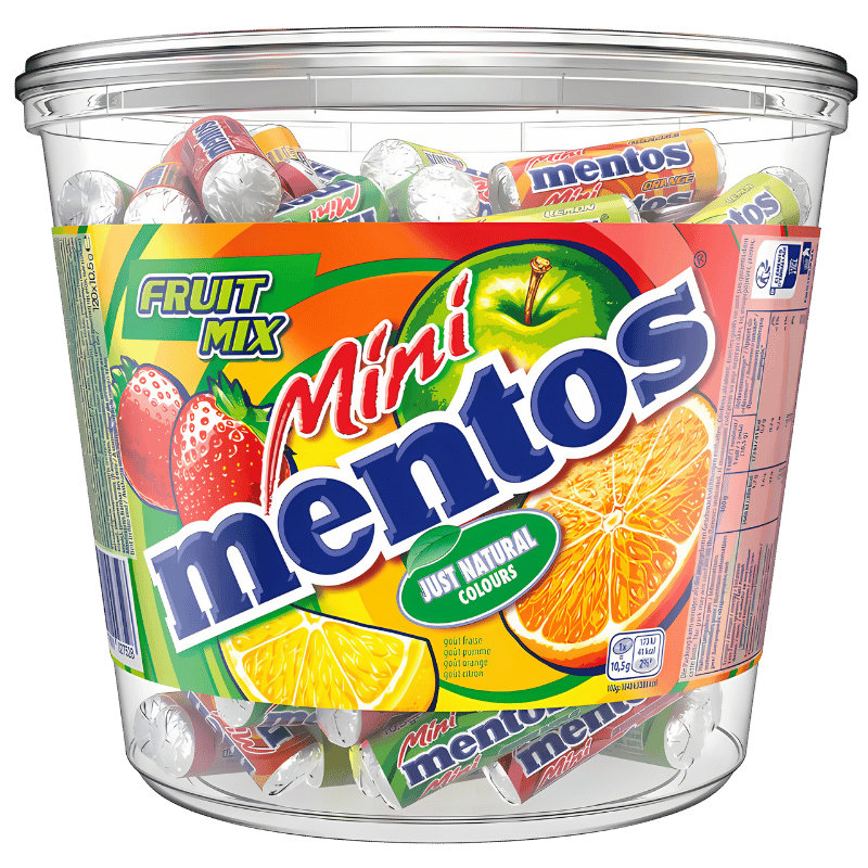 Fabriqués aux Pays-Bas, ces mini bonbons Mentos sont conditionnés dans une boîte économique de 1260g contenant 120 rouleaux individuels. Leur format mini en fait le compagnon idéal des déplacements, des cadeaux ou des paniers de partage.