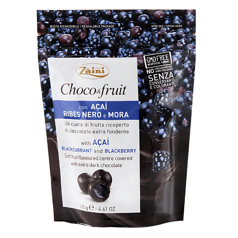 | Saveur | Acai, cassis et mûre enrobés de chocolat noir |